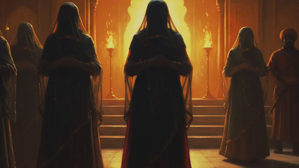 بیگمات کے نازک دل کانپ رہے تھے، لیکن اُن کے قدم رقص کرنے کے لیے حرکت پر مجبور تھے۔ اُن کی آنکھوں سے خون آنسو بہہ رہے تھے کیونکہ وہ ظلم، شرم اور اپنے وقار کی پامالی کو دیکھ کر اندر سے ٹوٹ رہی تھیں اور شرم و حیا کی شدت اُن کے جسم میں لرزش پیدا کر رہی تھی۔